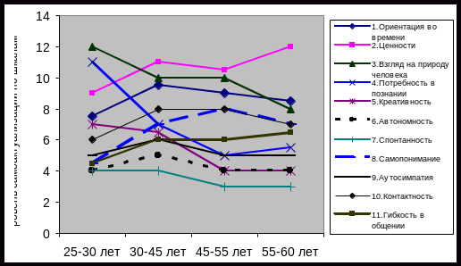 Высокая оценка взгляда на природу человека в раннем взрослом возрасте говорит о вере в людей, в могущество человеческих возможностей. В последующие периоды взрослости данная шкала убывает. Резкое снижение наблюдается в потребности в познании. В ранней взрослости человек всегда открыт новым впечатлениям, проявляет бескорыстный интерес к новым объектам, который сильно снижается уже к 30-45 годам, а к позднему периоду взрослости падает до своей минимальной отметки. В 55-60 лет потребность в познании возрастает, но незначительно. Взрослый человек ценности ставит высоко, чем он старше, тем значимость ценностей растет. Это говорит о том, что с возрастом человек всё больше стремится к гармоничному бытию и здоровым отношениям с людьми. Следующей по значимости идет шкала ориентации во времени. Эта шкала показывает, насколько человек живет настоящим, не откладывая свою жизнь "на потом" и не пытаясь найти убежище в прошлом. Меньший показатель приходится на период ранней взрослости, к 30-45 годам она возрастает и практически сохраняет свою позицию в следующие годы жизни взрослого человека, незначительно снизившись. Это означает, что только со среднего взрослого возраста человек начинает хорошо понимать экзистенциальную ценность жизни "здесь и теперь", наслаждаться актуальным моментом, не сравнивая его с прошлыми радостями. А в ранней взрослости человек страдает завышенным стремлением к достижениям, он еще мнителен и неуверен в себе. Схожую тенденцию имеет шкала контактности. Самый низкий показатель шкалы характерен для ранней взрослости, а высокий – для средней и поздней взрослости. Возможно, в период ранней взрослости для человека также важно общение, но у него еще не развита способность к установлению прочных и доброжелательных отношений с окружающими, как в более позднем возрасте. В предпенсионном возрасте уровень контактности снижается, возможно, это связано со снижением предрасположенности к контактам с другими людьми. Гибкость в общении с годами увеличивается и чем старше человек, тем легче ему самовыражаться в общении. Самопонимание также с возрастом растет. В ранней взрослости человеку еще свойственна неуверенность и пока он ориентируется во многом на мнение окружающих. В средний и поздний периоды взрослой жизни человек наиболее чувствителен и сензитивен к своим желаниям и потребностям. Аутосимпатия – это хорошо осознаваемая позитивная "Я-концепция", служащая источником устойчивой адекватной самооценки. Аутосимпатия же с периода ранней взрослости возрастает к периоду средней взрослости, а затем намечается ее спад. С аутосимпатией схожую тенденцию имеет шкала автономности. На графике видно, что личность чувствует себя более независимо и свободно в период средней взрослости. Креативность выше у людей раннего периода взрослости, а в последующие периоды снижается, что говорит о важности творческого отношения к жизни в ранней взрослости. Самый низкий показатель по шкалам имеет спонтанность. Человек более спонтанен в ранней и средней взрослости, менее – в поздней взрослости и предпенсионном возрасте. Низкие показатели шкалы, возможно, объясняются тем, что способность к спонтанному поведению фрустрируется культурными нормами.