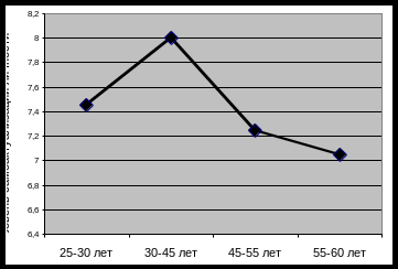 Из данного графика видно, что на протяжении периода взрослости стремление к самоактуализации колеблется. С периода ранней взрослости оно возрастает до максимума в период средней взрослости, а затем резко падает, придя к самому низкому показателю в возрасте 55-60 лет.