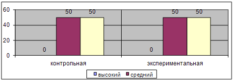 Итак, по данной диаграмме наглядно видно, что в контрольной и экспериментальной группах уровень развития зрительного восприятия примерно одинаков – 50% детей контрольной и экспериментальной группы имеют средний уровень развития зрительного восприятия, 50% - низкий уровень развития зрительного восприятия. Детей с высоким уровнем развития зрительного восприятия зафиксировано не было.