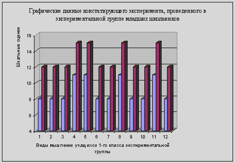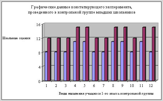 Целью констатирующего эксперимента являлась оценка вербально-логического и наглядно-образного мышления учащихся 3-го класса контрольной и экспериментальной групп, а также сопоставление между собой полученных показателей.