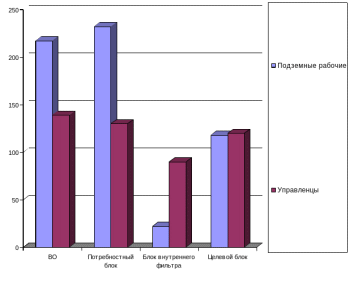 На рисунке также наглядно представлено наличие особенностей в структуре мотивации профессиональной деятельности шахтёров. Для подземных рабочих характерно преобладание внешних мотивов. Коэффициент корреляции Спирмена [– 0,77]; коэффициент корреляции Пирсона [– 0,78]), то есть связь между переменными сильная, обратная: чем выше должность, тем в меньшей степени актуальны мотивы внешних условий. Аналогичные различия были выявлены относительно мотивов потребностного блока (коэффициенты корреляции равны [-0,86] и [-0,85] соответственно. Связь между переменными в данном случае также сильная, обратная. Корреляционный анализ показал, что для управленцев более актуальны мотивы внутреннего фильтра (коэффициенты корреляции равны +0,79 и +0,78 соответственно). Связь между переменными сильная, прямая: чем выше должность, тем сильнее выражены мотивы блока внутреннего фильтра. При этом отметим дополнительно, что более очевидно различие в степени проявления мотивов потребностного блока. В проявлении мотивов целевого блока статистически достоверных различий встречено не было. Коэффициенты корреляции составили 0,02 и 0,19. Связь между переменными выявлена прямая, слабая.