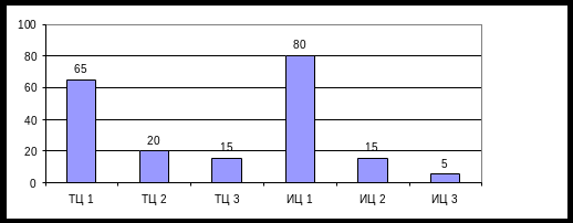 В пятую группу (ИЦ2) вошли те, кто приписал первые шесть рангов таким И-ценностям, как честность, непримиримость к недостаткам, образованность, смелость в отстаивании своего мнения, независимость, эффективность в делах. Их количество составило 3 человека (15%).