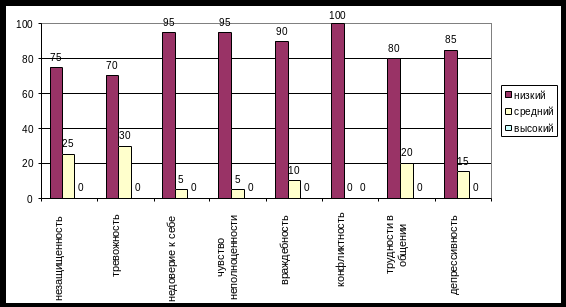 У 100% испытуемых был выявлен низкий уровень выраженности конфликтности, средний уровень и высокий уровень выраженности враждебности выявлены не были.