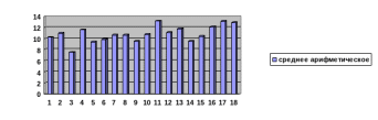 | Среднее арифметическое | 10,3 | 11,05 | 7,5 | 11,65 | 9,45 | 9,95 | 10,7 | 10,7 | 9,6 | 10,8 | 13,2 | 11,15 | 11,85 | 9,55 | 10,5 | 12,1 | 13,15 | 12,95 |