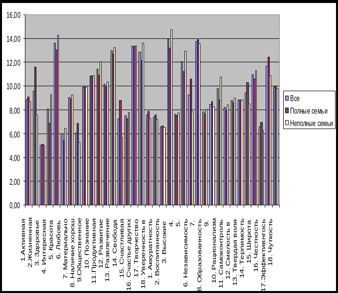 Из таблиц №№ 1.1., 1.2. следует: для старшеклассников из неполных семей наивысший ранг имеют такие ценности как «красота природы и искусства», «продуктивная жизнь», «развлечения», «счастье других», «творчество», и из средств достижения целей: «высокие запросы», «исполнительность», «непримиримость к недостаткам в себе и в других», «рационализм», «широта взглядов», «эффективность в делах». Достаточно высокий ранг занимают «познание» и «развитие». Таким образом, они ориентированы на ценности социального взаимодействия, социальной успешности, стремятся к индивидуальной самореализации («развитие», «познание», «продуктивная жизнь», «творчество»). Они более требовательны и к себе и другим, для них важны дисциплинированность, умение понять чужую точку зрения, желание уважать иные вкусы, обычаи, привычки, умение здраво и логично мыслить, принимать обдуманные и рациональные решения, трудолюбие, продуктивность в работе. Старшеклассники из неполных семей стремятся к переживанию прекрасного в природе и в искусстве, к творческой деятельности и мечтают о счастье других: о благосостоянии, развитии и совершенствовании других людей, всего народа, человечества в целом. Также они нацелены на развлечения. Причиной могут быть возрастные особенности, обстоятельства в семье и другие.