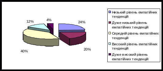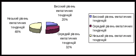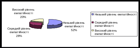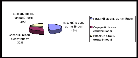 Аналіз отриманих результатів проведеної методики в ЕГ показав, що у більшості досліджуваних (а це 48 %) дуже низький рівень емпатії, що свідчить про те, що емпатійні тенденції особистості слабо розвинені, або не розвинені взагалі. Значна частина досліджуваних (32 %) мають середній рівень сформованості емпатії. Є також досліджувані, що мають високий рівень емпатійності – 20 % (Рис. 4).