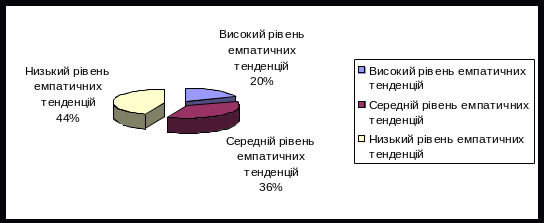 Аналіз отриманих результатів проведеної методики в ЕГ показав, що у більшості досліджуваних (а це 44 %) низький рівень емпатичних тенденцій, що свідчить про те, що емпатичні тенденції особистості слабо розвинені, або відсутні. Значна частина досліджуваних (36 %) мають середній рівень сформованості емфатичних тенденцій. Є також досліджувані, що мають високий рівень емпатичності – 20 % (Рис. 7).