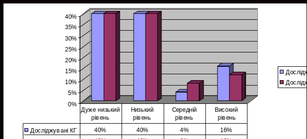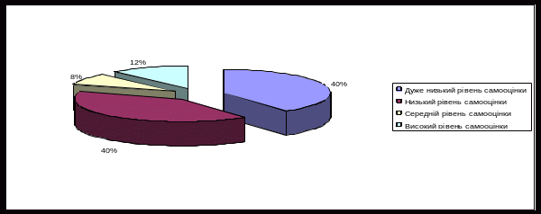 Аналіз проведеного анкетування показало, що у більшості досліджуваних експериментальної групи дуже низький і низький рівень самооцінки, невеликий відсоток 8 % - середній рівень самооцінки, і лише 12 % високий (Рис.1).