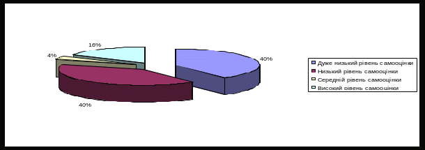 Аналіз проведеного анкетування показало, що у більшості досліджуваних експериментальної групи дуже низький і низький рівень самооцінки, невеликий відсоток 4 % - середній рівень самооцінки, і лише 16 % високий (Рис. 2).
