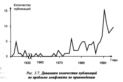 В последующие 30 лет правоведы вообще не обращались к проблеме конфликта. С конца 50-х годов появляются работы, посвященные правовым аспектам международных конфликтов. С начала 70-х годов наблюдается усиление интереса правоведов к проблеме конфликта (рис. 3.7).