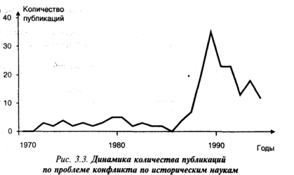 Рис. 3.6. Динамика количества публикаций по проблеме конфликта по политическим наукам
