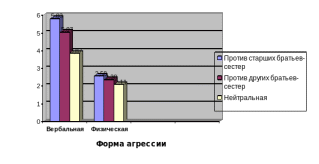 2) наказание детей (в одном варианте — старших, в другом — младших). Очевидно, при такой суженной альтернативе нейтральная позиция действительно оказывается относительно (и только относительно) лучшей. Однако возможны и другие альтернативные способы родительского реагирования на агрессию между сибсами, которые не были здесь предметом изучения. Одним из таких способов реагирования является обсуждение возникшей проблемы, осуществление переговорного процесса, научение на конкретном примере возникшего конфликта конструктивным, неагрессивным способам его разрешения. Ведь, как экспериментально доказано в других исследованиях, агрессивные дети отличаются от неагрессивных в первую очередь именно слабым знанием конструктивных (альтернативных агрессивным) способов разрешения конфликтов.