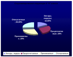 Изучив социометрическую структуру группы испытуемых 8 «б» класса мы выявили, что в группе 4 звезды, причем, наглядно рассмотрев социограмму 2, мы можем видеть, что только 1 лидер (4%) (Ольга А.) имеет положительные связи с одноклассниками, остальные 3-е лидеров (12%) связаны с другими чаще отрицательными связями. В данной группе также имеются 6 учащихся (26 %), которые причислены в категорию отвергаемых; 7-ро учащихся (29 %) – предпочитаемые и 7-ро учащихся (29 %) – принимаемые. На рисунке мы можем видеть, что наибольшее количество отрицательных выборов имеет Яна Я., которая по данным предыдущего исследования имеет высокий индекс враждебности-агрессивности в отношениях. Наглядно социометрическую структуру мы можем представить в виде диаграммы 3.