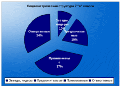 Изучение социометрической структуры группы испытуемых 7 «в» класса показали, что в группе 2 эмоциональных лидера (9,5 %), «звезды», которые в равной степени собирают вокруг себя членов группы. Четверо членов группы (19 %) оказались в числе предпочитаемых, а 8 испытуемых (38 %) – в числе принимаемых. Очень огорчает тот факт, что в категорию учащихся отвергаемых коллективом входят 7 испытуемых (33,5 %). Связано это, прежде всего с тем, что данная категория детей часто болеет, и редко посещают школу. В категорию эмоционального лидера попал учащийся с высоким показателем индекса враждебности и агрессивности, что дает основание предполагать, что данный лидер, прежде всего, собирает вокруг себя учащихся агрессивных и покорных, т.е. вероятнее всего – он лидер какой-либо группировки. Социометрическую структуру группы мы представили в виде диаграммы 2.