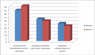 Аналізуючи результати тестування старшокласників, можна зробити висновок, що в своїх уявленнях більшість з них відповідають 1-й групі аспектів щодо відношення до своєї майбутньої дитини – оптимальний емоційний контакт з дитиною (дівчата 50 %, юнаки 43,75 %), трохи менший показник старшокласників відповідає другій групі аспектів щодо відношення до своєї майбутньої дитини − надмірна емоційна дистанція з дитиною (дівчата 28,57 %, юнаки 31,25 %), і третя група виявила найменшу кількість респондентів – надмірна концентрація на дитині (дівчата 21,43 %, юнаки 25 %). (Див. Додаток 5)