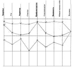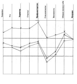 На этом графике мы можем проследить достаточное расхождение реальной и идеальной СО почти по всем параметрам, кроме шкалы общая оценка себя. Можно предполагать, что обследуемый имеет свою оценку себя, достаточно сильно отличающуюся от оценок окружающих его людей. Необходимо особое внимание обратить на шкалу социальные контакты, так как на графике мы можем увидеть, что именно на данной шкале у обследуемого низкая реальная СО, что говорит нам о том, что он мало общается. Не хочет знать и принимать мнение других. Если посмотреть на линию достижимой СО, то именно только по шкале социальные контакты она имеет также низкий уровень, что предполагает нежелание обследуемого развитие социальных контактов. Если проследить линии реальной и достижимой СО далее, то мы можем предполагать, что причиной нежелания общения является оценка обследуемым своей внешности. Так как именно на шкале внешность у обследуемого самые низкие показатели, после социальных контактов. СО устойчивая – обследуемый принимает себя – «хорошо оцениваю себя». Слова: «пересмотреть критерии, поработать над собой», говорят о том, что обследуемый думает о себе и заботится о том, «чтобы люди понимали меня лучше и я их поняла».