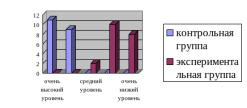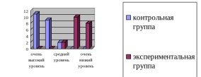 На рисунке 5 видно, что в основном дети контрольной группы обладают очень высоким и высоким уровнем развития пространственного восприятия, дети экспериментальной группы – очень низким и низким.
