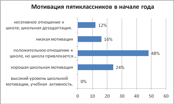 Как показывает диаграмма на рисунке 3, высокий уровень школьной мотивации не выявлен ни у кого из пятиклассников. Хорошая школьная мотивация отмечается только у шестерых учеников (24%).