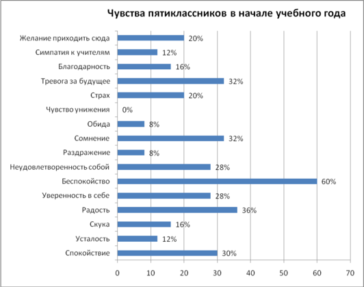 Таким образом, в начале учебного года у пятиклассников отмечается преобладание отрицательных чувств. Для большинства учащихся характерно беспокойство, что говорит о низком уровне школьной адаптации.