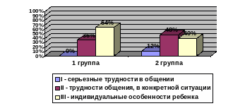 36 % детей первой группы и 48 % детей второй группы, испытывают трудности в общении обусловленные не отношением к взрослому, а конкретной ситуацией или недостатками воспитания.