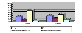 8% и 16% детей первой и второй группы имеют завышенную самооценку, после некоторых раздумий и колебаний, ставили себя на самую высокую ступеньку, называли какие-то свои недостатки и промахи, но объясняли их внешними, независящими от него, причинами, считали, что оценка взрослых в некоторых случаях может быть несколько ниже его собственной: «Я, конечно, хороший, но иногда ленюсь. Мама говорит, что я неаккуратный».