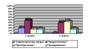 «Пренебрегаемых» детей в первой группе было 16%, а во второй 44% детей – этих детей просто не замечают, их как будто нет в группе, как правило, это тихие, малоактивные дети, которые играют в одиночестве и не стремятся к контактам со сверстниками.