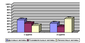 Личностные мотивы общения со взрослым, характерны 24% детям первой группы и 48% детей второй группы. Личностные мотивы характерны только для общения как самостоятельного вида деятельности. В этом случае общение побуждается самим человеком, его личностью. Это могут быть отдельные личностные качества, а могут быть отношения с другим человеком как с целостной личностью (Рис. 2).