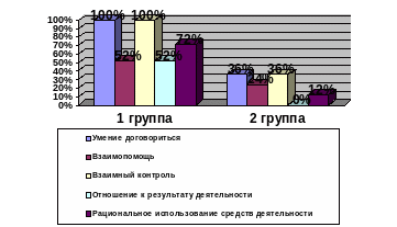 Из диаграммы, мы видим, что наличие положительного роста факторов в первой группе детей, отмечается по всем отслеженным показателям, причем, по первому и третьему на 100%. Во второй группе детей, отсутствует четвертый показатель: отношение к результату деятельности как к своему, так и партнера, а в первой группе он составляет 52%. Здесь вероятно проявляется привычка ожидания более компетентной оценки со стороны взрослого, а не со стороны сверстников. Важность оценки и умение ее делать, проявляется достаточно ярко, в первой группе детей, так как отношения в микросреде самой группы более разнообразны и демократичны.