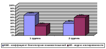 Сравнивались результаты групп по уровню КБВ (коэффициент благополучия взаимоотношений) и ИИ (индекс изолированности), позволило обнаружить различия данного параметра. В первой группе он составляет 68% детей, во второй группе – 40% детей. Это говорит о том, что большинство детей первой группы находятся в благоприятной статусной категории. В то же время, анализ результатов индекса изолированности показывает, что в первой группе детей имеющих такой статус, значительно меньше, чем во второй группе. Их соотношения равны: первая группа – 32%, вторая группа – 60%. Таким образом, можно констатировать, что индекс изолированности действительно отражает существенные качественные характеристики внутригрупповых процессов (Рис. 4).