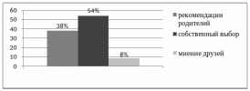 Значительная доля школьников руководствуется собственным выбором при выборе профессии (Диаграмма 5). Можно предположить, что эти показатели вызваны ростом самостоятельности подростков.