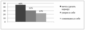 Уверены в своих силах и стремятся к карьере 31% молодежи; 46% молодых людей также задумываются о карьере, но пока только на уровне мечты; 23% школьников не уверены в своих силах (Диаграмма 1).