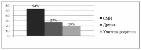Основным источником информации для нынешней молодежи является СМИ – такой вариант выбрало большинство опрошенных (54%). Наименее значимым источником информации является информация от родителей (Диаграмма 4). Это подтверждает тот факт, что молодежь оказывается наиболее восприимчивой к влиянию СМИ, которое оказывает огромное воздействие на познавательную сферу и, формирует определенные стандарты мышления и стереотипы поведения.