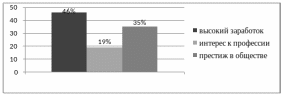В число наиболее важных мотивов, которыми руководствуется большинство опрошенных при выборе профессии вошли: материальная обеспеченность («высокий заработок») – 46% опрошенных; «престижность профессии» - 35%опрошенных, и вариант: «интерес к профессии» выбрало 19% учеников (Диаграмма 3). Мотивы выбора профессии направлены на себя и собственное материальное благополучие.