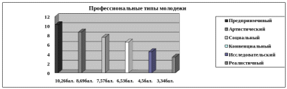 Следующая методика - методика «Профессиональной напрвленности Дж. Холланда», была проведена с целью определения профессиональной направленности группы молодежи, а именно учащихся 10-11-ых классов. С ее помощью мы определили доминирующие профессиональные типы (Диаграмма 6).