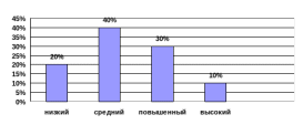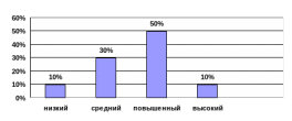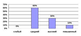 В течении второй недели после просмотра мультфильмов была отмечена общая повышенная возбудимость детей. Некоторые дети начинали играть игрушками, изображающими героев мультфильмов (при этом игры всегда носили агрессивный характер), другие же сами представляли себя героями мультфильмов, причем каждый хотел быть самым главным героем, что сразу же порождало конфликты. Понаблюдав за поведением детей, была произведена следующая оценка уровня агрессивности детей по методике Лаврентьевой Г.П.: 10% детей имеют слабый уровень агрессивности, 30% средний, 50% высокий и 10% повышенный уровень агрессивности (таблица 6 и рисунок 4):