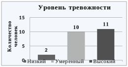 В случае тревожности низкий уровень отмечается у 2 (9 %) человек, умеренный – у 10 (43%) человек, а высокий – у 11 (48 %) учащихся.