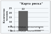 Было выявлено, что у 22 (95%) учащихся риск суицида незначителен. Но у 1 (5%) человека риск суицида значителен, что предполагает необходимость обратиться к психологу или врачу-психотерапевту за квалифицированной помощью. При склонности к суицидальному поведению среднее арифметическое: