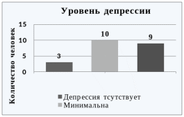 Анализ результатов показал, что у 3 (14%) человек депрессия отсутствует, у 10 (45%) человек она минимальна, а для 9 (41%) человек характерна лешкая депрессия.