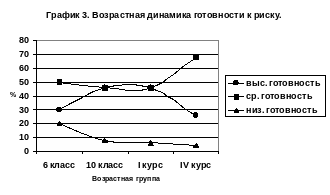 Результаты исследования показали, что испытуемым как подросткового так и юношеского возраста не свойственен низкий уровень готовности к риску. Более того склонность к осторожности снижается. Преобладающим является средний уровень готовности к риску, который особенно резко возрастает в позднем юношеском возрасте. Уровень склонности к риску и излишней осторожности к риску гораздо выше, чем низкий уровень и сравним со средним уровнем (10 кл., I к, но в 6 кл. и на IV к – ниже, чем средний уровень). Кроме того, излишняя склонность к риску снижается и имеет особенность «усредняться», особенно на IV курсе.