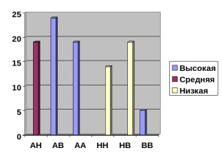 Рис. 2 Соотношение данных по уровням совместимости супругов и сочетаний самооценок супругов