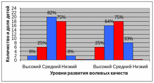 Описанные различия в уровнях развития таких волевых качеств, как «сила воли» и терпеливость, приводятся на рис. 1.