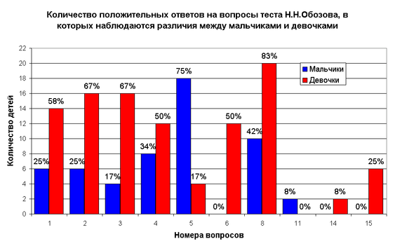 Кроме интегральных показателей уровней «силы воли» и терпеливости нами был осуществлен качественный и количественный анализ ответов на вопросы обоих тестов: по 15-и вопросам 1-го теста и 18- и вопросам 2-го теста. Таким образом, в общей сложности был изучены особенности ответов мальчиков и девочек на каждый из 23-х вопросов двух методик.