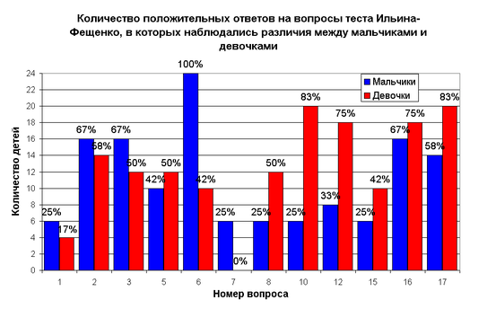Максимальными были различия в ответах мальчиков и девочек на вопросы № 5, 6, 15.