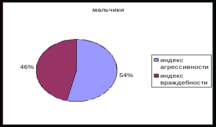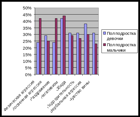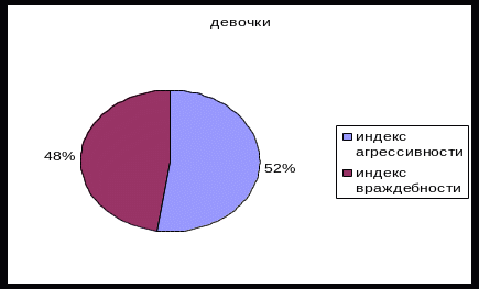 При этом индексы агрессивности мальчиков и девочек практически равны, а индекс враждебности девочек превалирует над индексом враждебности мальчиков. По отдельным шкалам степень враждебности, обиды девочек превосходит степень враждебности, обиды у мальчиков. Так же степень выраженности подозрительности девочек превалирует над степенью выраженности подозрительности мальчиков.