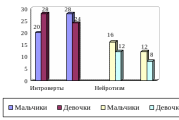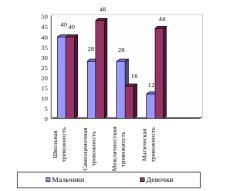 Проанализировав полученные результаты, мы пришли к выводу, что в исследуемой нами группе у девочек самооценочная и магическая тревожность выше (92%), чем у мальчиков (40%). Школьная тревожность в исследуемой группе одинакова как у мальчиков, так и у девочек (по 40%), но у мальчиков межличностная тревожность выше (28%), чем у девочек (16%). Исследование показало, что тревожность выше у девочек, чем у мальчиков.