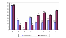 VII Низкая физиологическая сопротивляемость стрессу – 4 мальчика (16%) и 6 девочек (24%)
