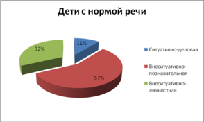 По результатам исследования большинству обследованных нами детей пятого года жизни с нормой речи свойственна внеситуативно-познавательная форма общения, которая является ведущей в возрасте от 3 до 5 лет. У двух детей пятого года жизни с нормой речи ведущее место начала занимать внеситуативно-личностная форма общения (таб.1, рис.1).