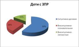 Нами были проанализированы речевые высказывания детей с ЗПР и нормой речи по нескольким параметрам. Чаще и больше всего дети с ЗПР говорили в ситуации, моделирующей ситуативно-деловую форму общения (59% всех высказываний). Намного меньше дети говорили в ситуации, моделирующей внеситуативно-познавательную форму общения (26%). И лишь 15% всех высказываний приходятся на долю внеситуативно-личностной формы общения (таб. 2, рис. 2).