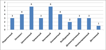 У 4 подростков был выявлен тип акцентуации характера "Оптимист". Эти подростки чрезмерно контактны, словоохотливы. Они нередко сами бывают инициаторами конфликтов, но огорчаются, если окружающие делают им замечания по этому поводу. Они привлекательны для партнеров по общению, людей данного типа характеризуют энергичность, жажда деятельности, оптимизм, инициативность.