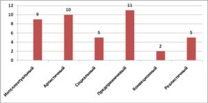 Результаты диагностики Опросника Дж.Холланда показали, что Интеллектуальный тип личности имеют 9 подростков. Они предпочитают выполнять работу, требующую силы, ловкости, подвижности, хорошей координации движений, навыков практической работы. Эти подростки охотнее делают, чем говорят, они настойчивы и уверены в себе, в работе предпочитают четкие и конкретные указания.